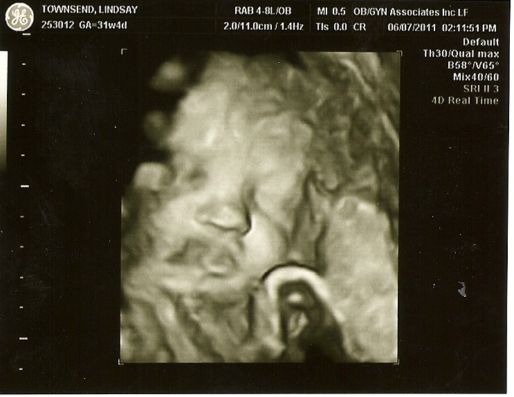 Today I had another ultrasound to follow-up on why my belly was measuring small last week and to follow-up on my bloodwork. The ultrasound showed that he is weighing 3 pounds 11 ounces, his head was measuring in the 90th Percentile, which I believe I saw was about 8cm. His belly only measured in the 3rd Percentile, which is a little small for where he is supposed to be. I think when she was measuring his belly is gestational age was 29 weeks for his belly. His overall age, was 32 weeks 4 days. The ultrasound tech said that his head was making up for his belly at this point. He is also head down already at this point and I believe he was facing my right side and that his feet are up and around my right side which is where he has been jabbing me in the side pretty good. We got to see all 4 chambers of his heart funtioning good, he was also breathing, but he was being difficult he would breath several times and stop and then breath again. The ultrasound tech said that was all normal though. My cervix, placenta, and amniotic fluid all looked good along with the blood flow threw the umbilical cord. The babies heart rate was 151 bpm. Overall, everything looked good besides his belly measurement. All of my bloodwork, blood pressure, and weight all looked good. Due to his belly measurement the doctor recommended that I get a weekly BioPhysical Ultrasound which measures his fetal movements and follow-up with the doctor following the ultrasound, and then in 3 weeks we will get another growth ultrasound to make sure he is continuing to grow like he is supposed to. She just instructed me to count his kicks and make sure I am counting 10 kicks in an hour just once a day. So all in all everything looked good. Let just keep our fingers crossed that everything continues to look good and we have a healthy little boy in about 8 1/2 weeks.